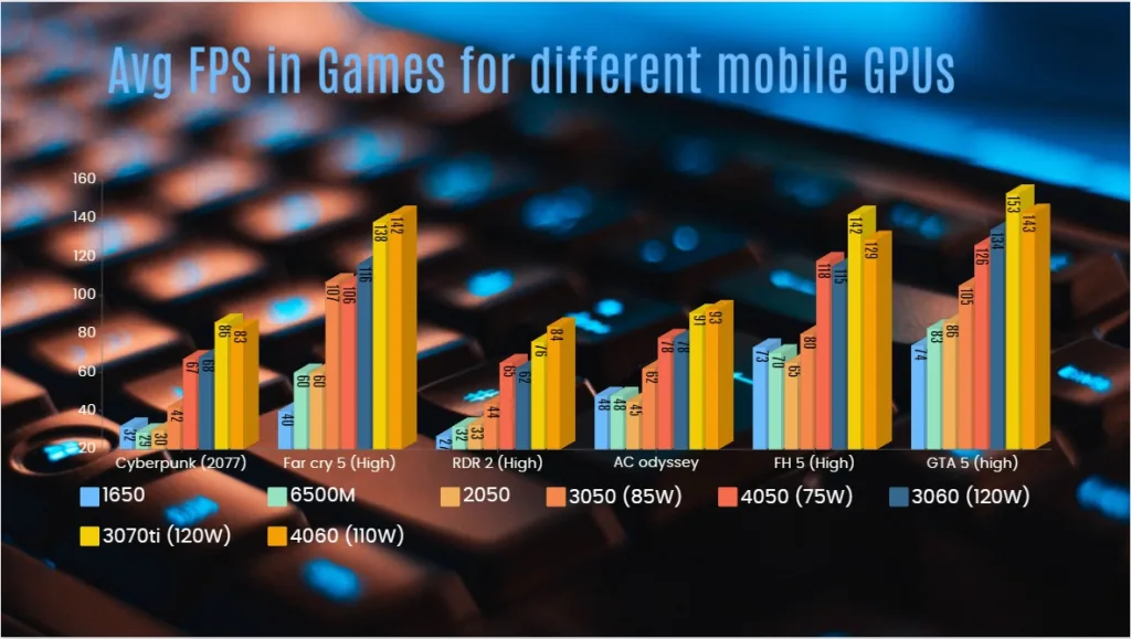 As you can see, there is a pretty significant gap between the performance of 2050 and 3050 as well as between 3050 and 4050. Cards such as 1650,2050 and 6400M perform similarly, with less than 20% performance difference. which is the same for 4050 and 3060 as well as 3070ti and 4060. hence, due to the significant efficiency gains of the 4000 series, as well as the groundbreaking technology of frame generation (inserting intermediate frames using entirely AI-generated frames,