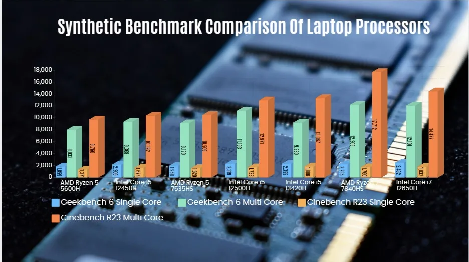 We have laptops with processors ranging from a sensible Ryzen 5 5600H to absolute behemoths like the i9 13980HX. for ease and simplification, we have provided the benchmarks of some of the most widely available processes under 1 lakh, which have been added to the list. Do keep in mind that the benchmark figures are approximate, and will change based on the laptop/performance settings.